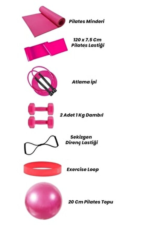 Exercise Mat Tire Jumping Lanyard 2 x 1 Kg Dumbbell Octagonal Rubber Resistance Tire and 20 Cm Ball Introducing our new workout set! Including Pilates Cushion, Pilates Band, Jumping Rope, 2 Pieces 1 Kg Dumbbell, Eight Shaped Rubber and Aerobic Band, this set is the perfect choice for those who want to play sports at home. The Pilates cushion supports your back, shaping your body and improving your balance. The Pilates band increases your muscle strength and increases your elasticity. Jumping rope improves your cardiovascular health and increases your coordination. 2 pcs 1 kg dumbbells strengthen your arm and shoulder muscles and increase your muscle mass. The eight-shaped rubber and aerobic band are designed to target different muscle groups in your body. Our set is designed to provide a full body workout routine at home. The high-quality materials of our product have a long service life and are easy to use. You can easily use it at home, in the office or even on your travels. Thanks to its compact design, it is also very easy to store. Introducing our 20 cm mini pilates ball, a small but effective exercise tool! This ball is an excellent choice for pilates, yoga, fitness and rehabilitation exercises. This workout kit offers everything you need to get you in shape and lead a healthy lifestyle. Order now and reinvent yourself!