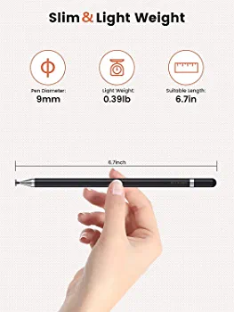 The stylus pen glides smoothly on the screen, making it a pleasure to use rather than just a necessity. It features a soft fiber tip that is perfect for browsing or scrolling web pages, while the transparent disc tip provides greater accuracy for taking notes, drawing, playing games, cutting videos, and more. The stylus pen is the same size and weight as a regular ballpoint pen, making it easy to get used to.