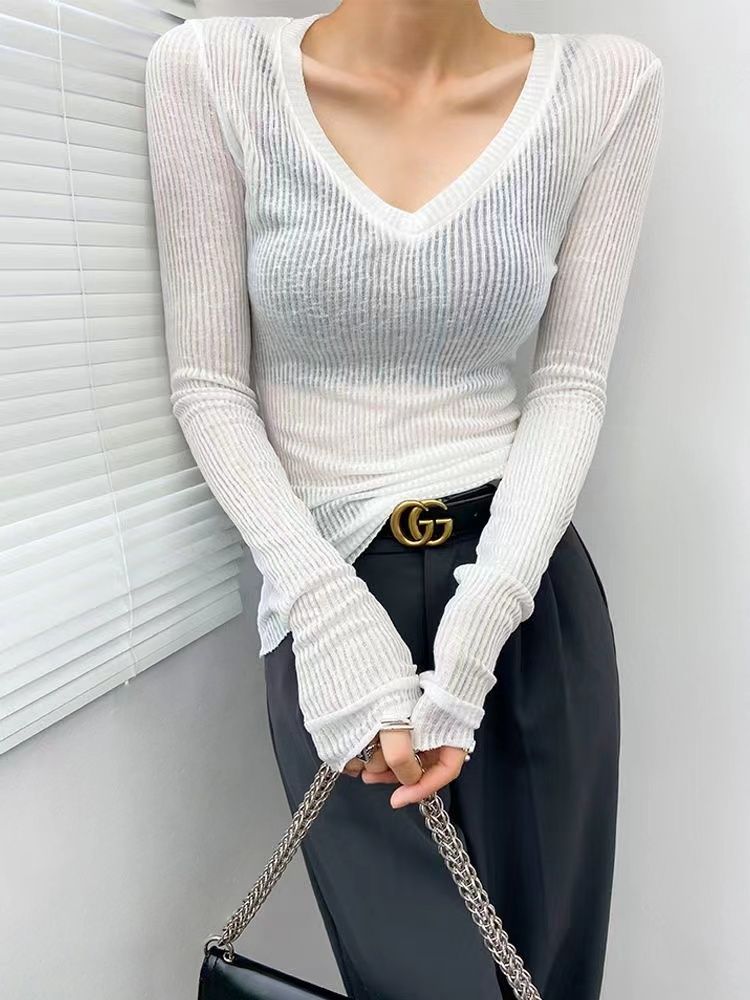 | nameOriginal | Translucent Top Long-sleeved Shoulder T-shirt Women's Spring and Summer Micro-transparent Sunscreen Blouse Sexy V-neck Knit Thin Inner Shirt |