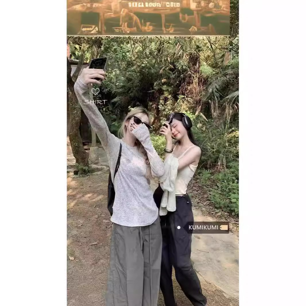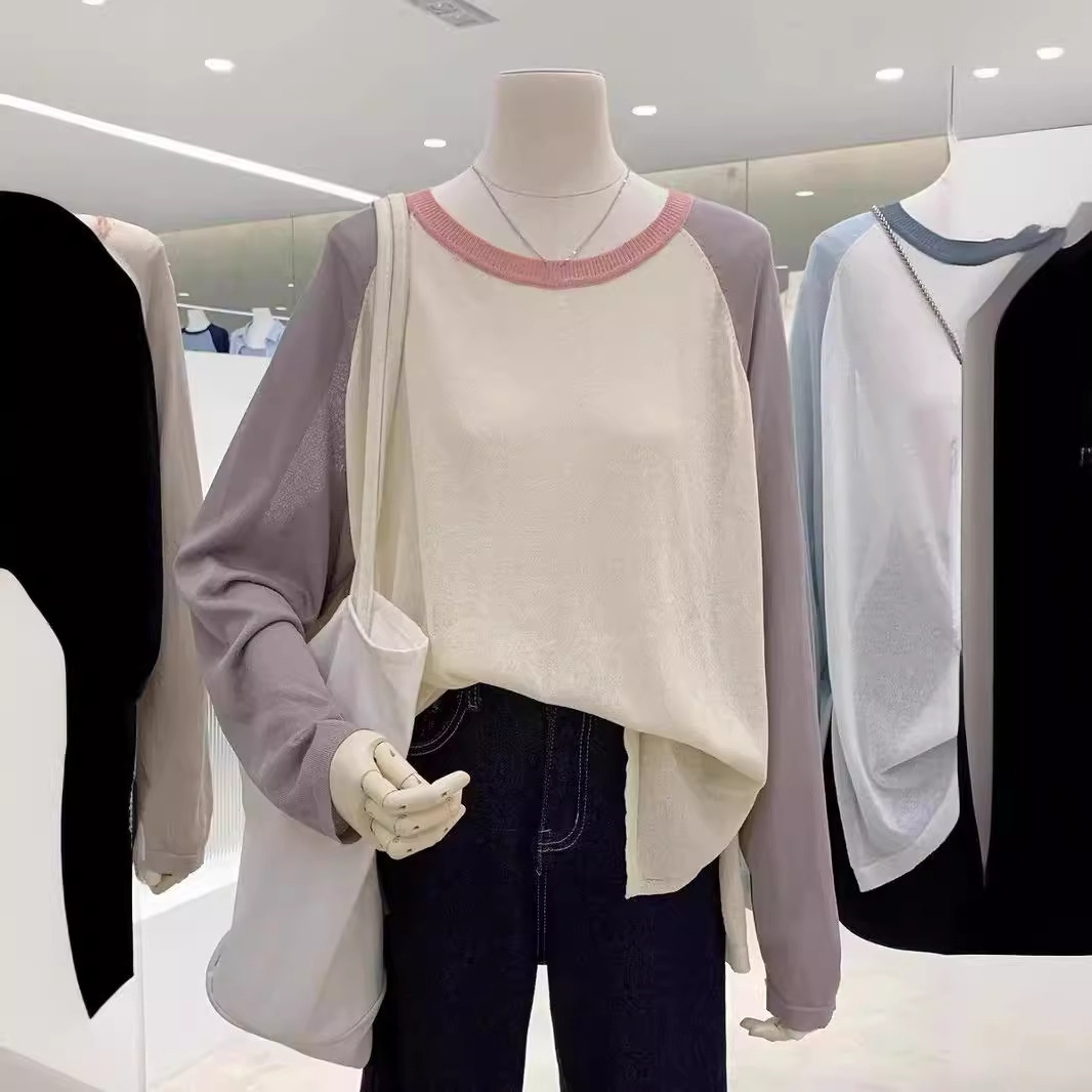 Translucent Top Long-sleeved Shoulder T-shirt Women’s Spring and Summer Micro-transparent Sunscreen Blouse Sexy V-neck Knit Thin Inner Shirt