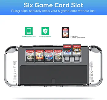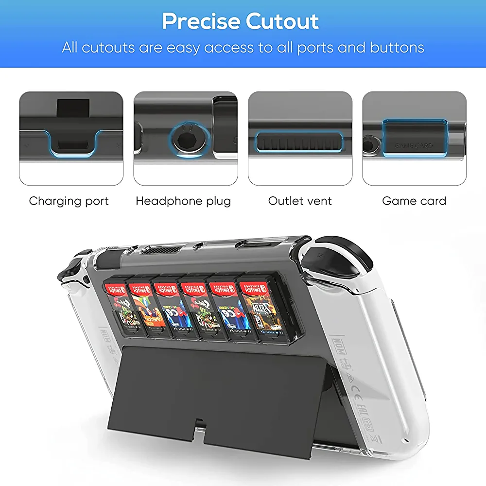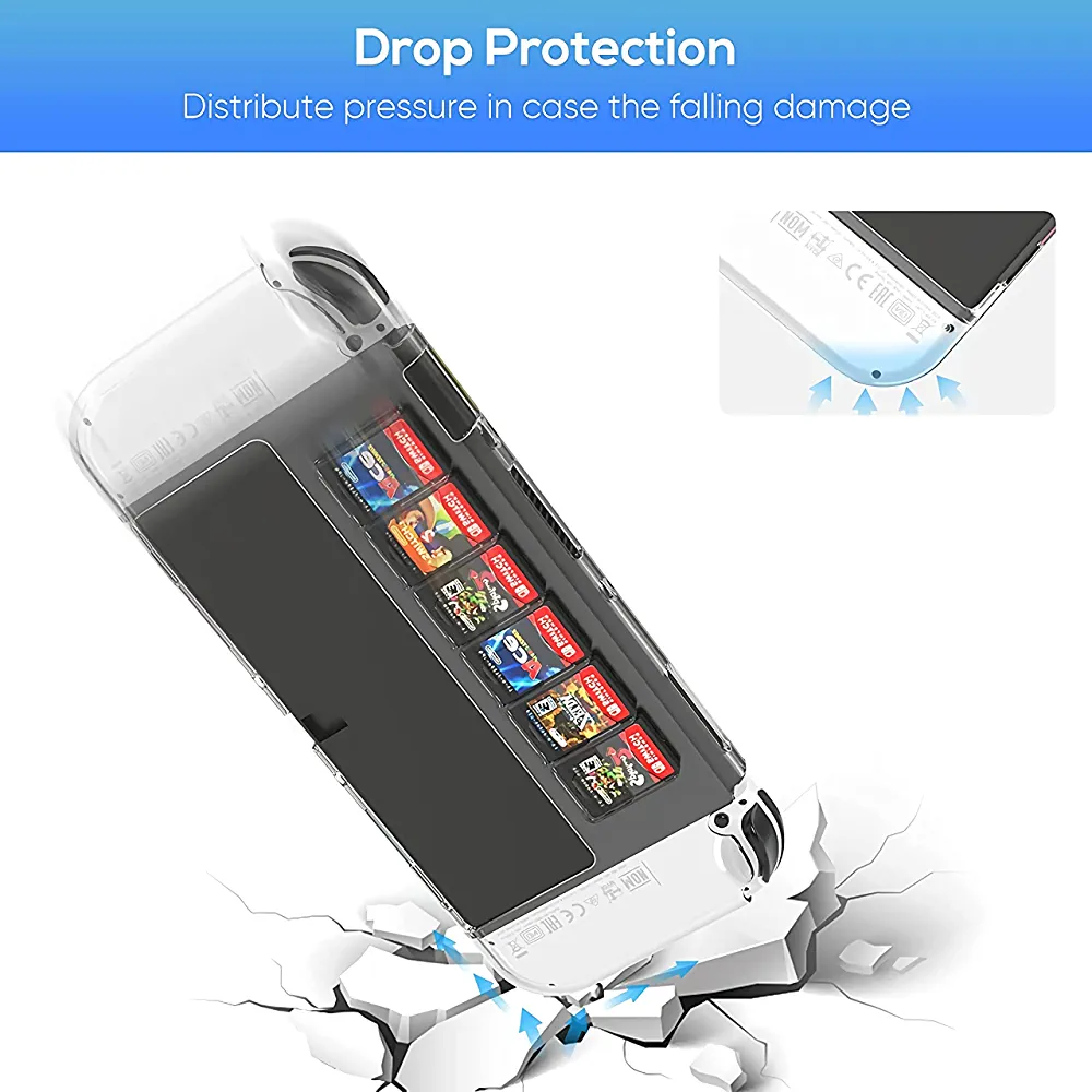 Transparent protective case for Nintendo Switch OLED model with game card storage and shockproof features.