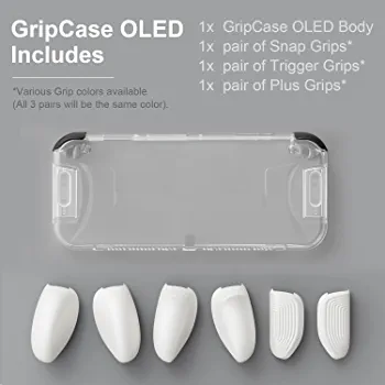 The GripCase OLED features interchangeable grips that can be easily swapped out to fit all hand sizes, ensuring a comfortable and secure grip during extended gaming sessions. The transparent design allows the beauty of the OLED screen to shine through while also providing protection against scratches, bumps, and drops.