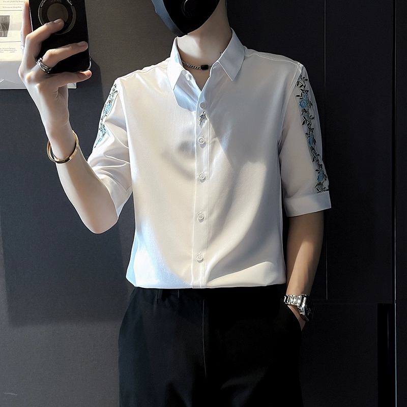 | nameOriginal | Trendy black slim fit handsome embroidered three-quarter sleeve shirt |