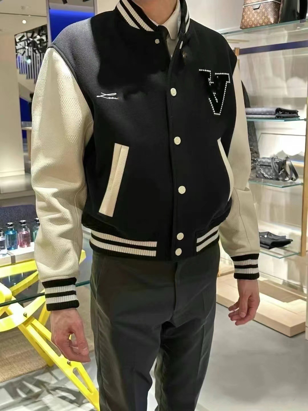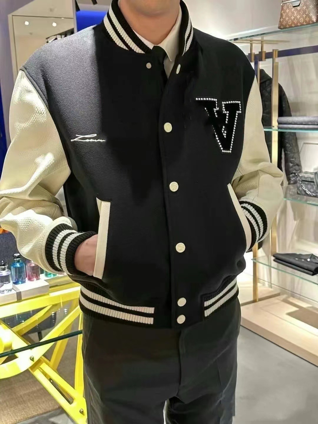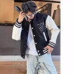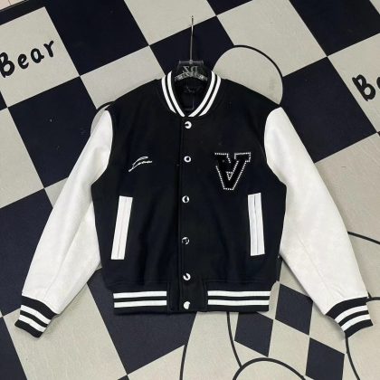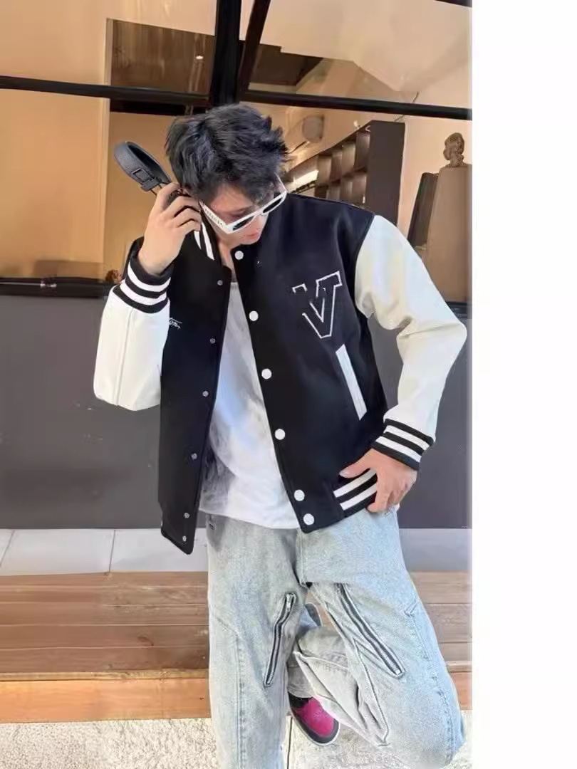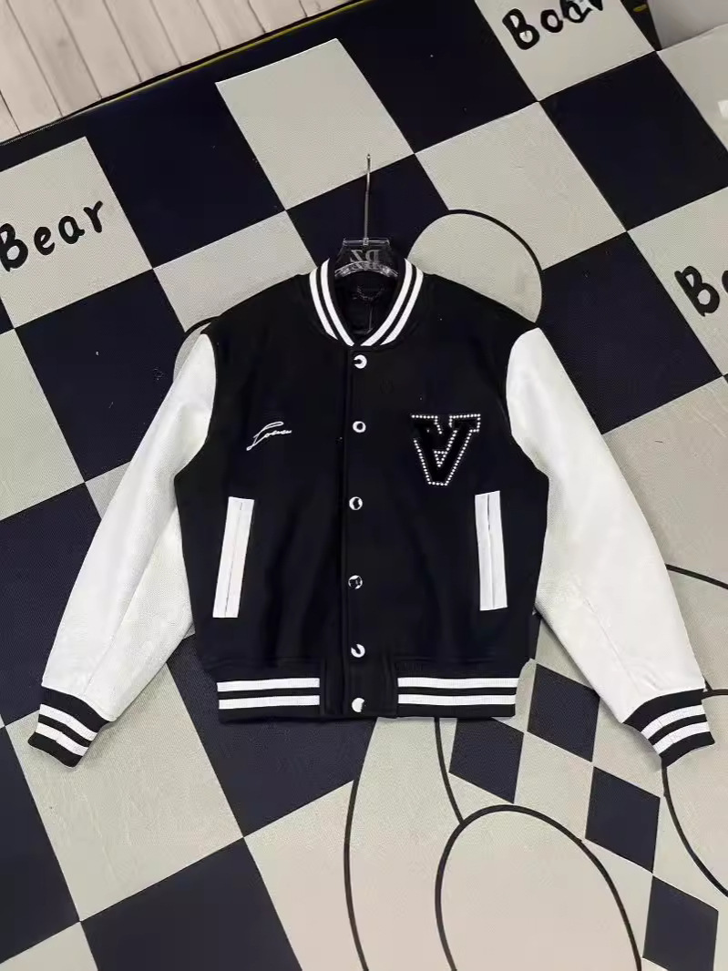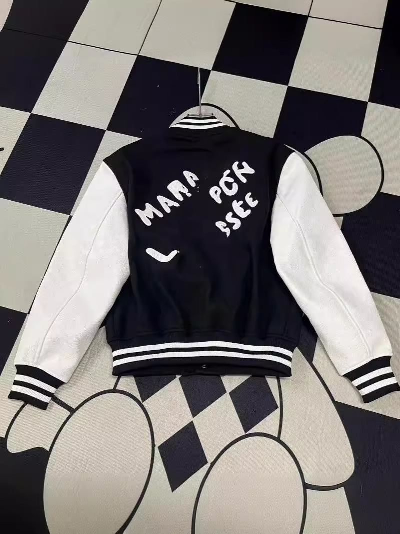 Trendy Brand 24 Spring and Summer New Contrast Color Leather Sleeve Wool Embroidered Fixed Bead Threaded Collar Black and White Baseball Clip Unisex