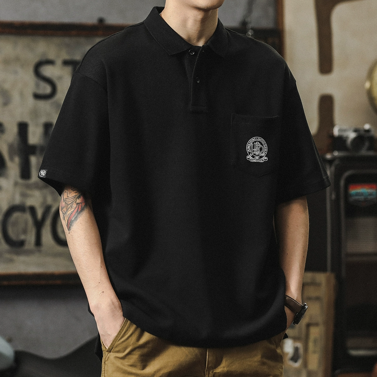 Trendy brand comfortable black loose short-sleeved lapel T-shirt