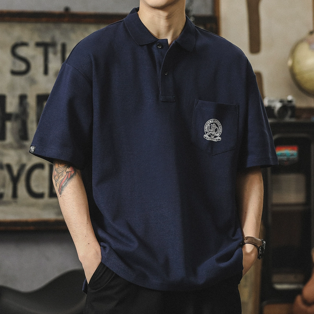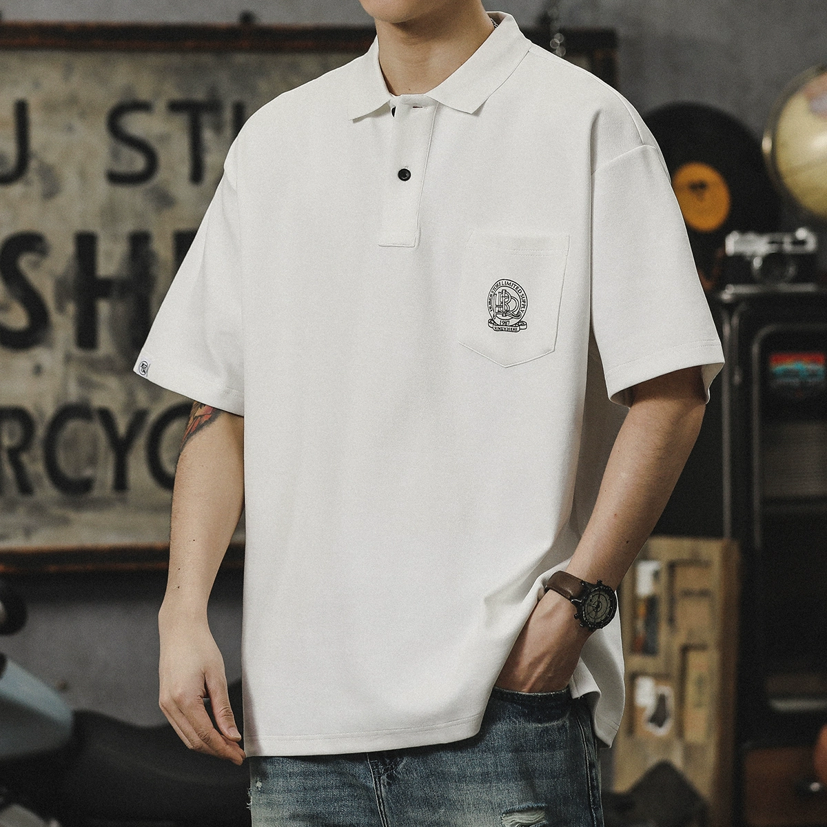 Tide brand comfortable black loose short -sleeved lapel T -shirt