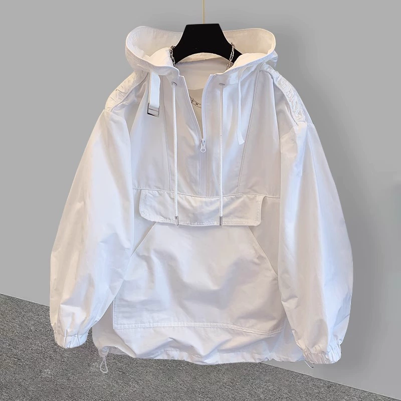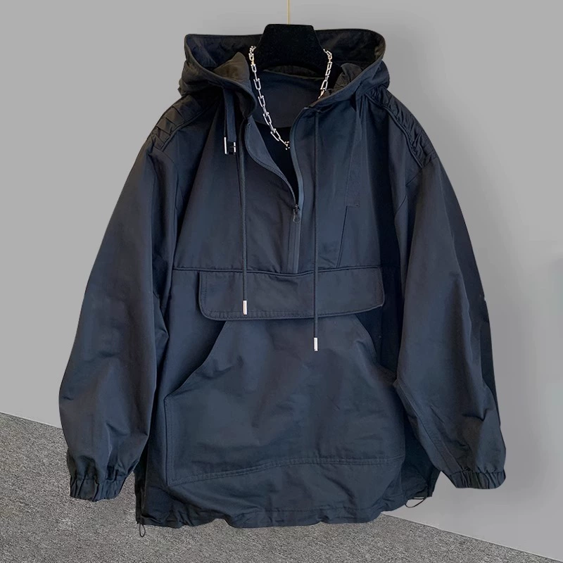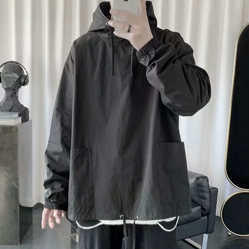 Tide brand pocket worker stitching design sense hooded sunscreen jacket men’s thin trend loose jacket trench coat
