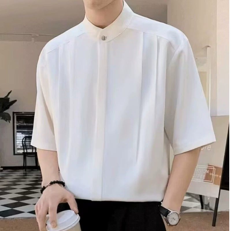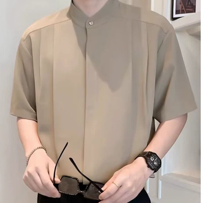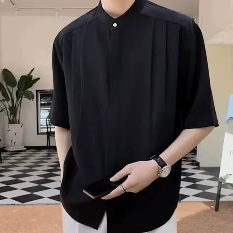 | nameOriginal | Trendy drapey stand-up collar ice silk light mature style short-sleeved shirt |