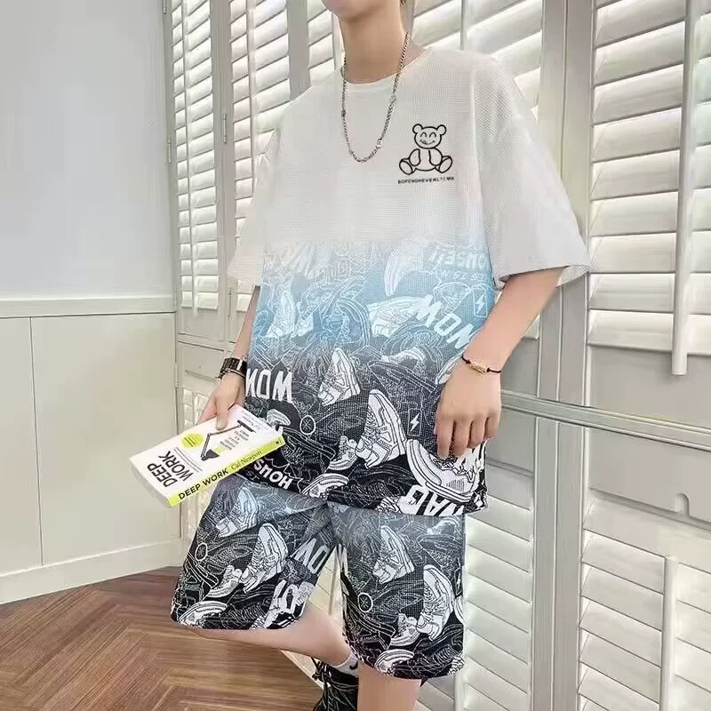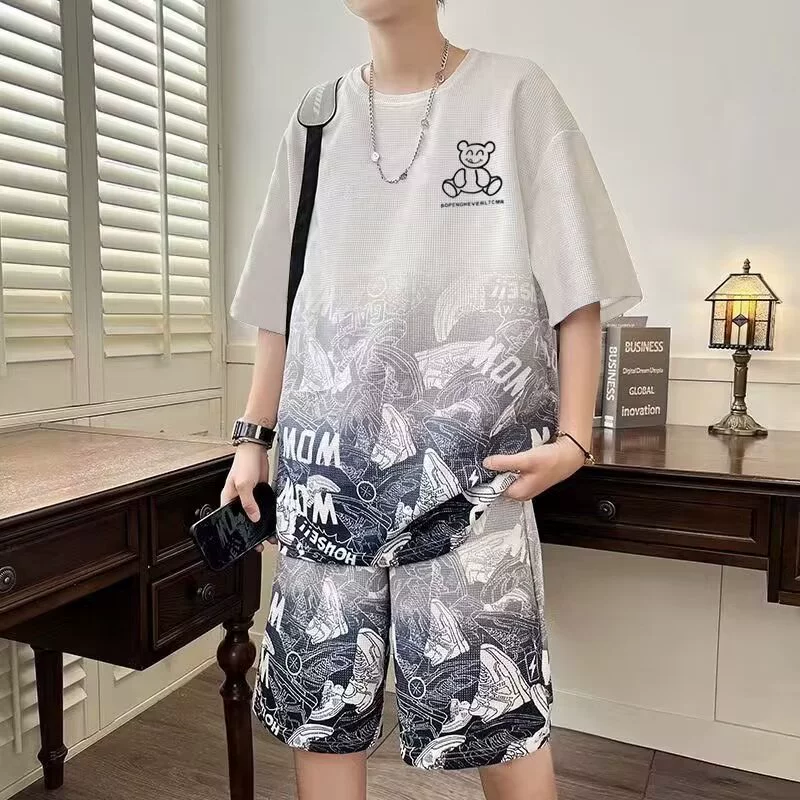 Trendy gradient color bear men's summer short-sleeved T-shirt