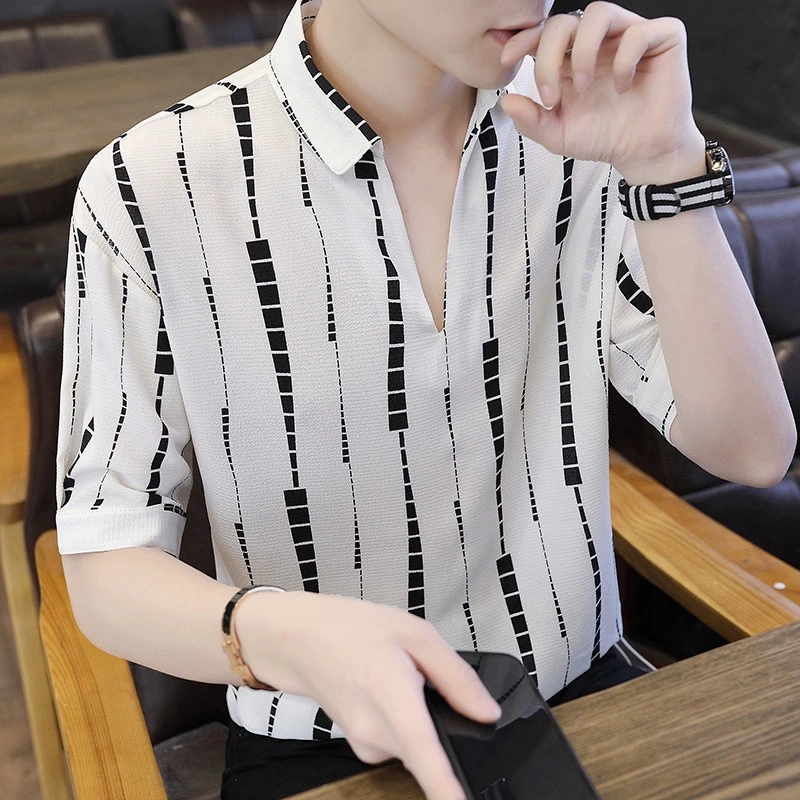 Tide brand ice silk Polo shirt, handsome summer V -neck short sleeve