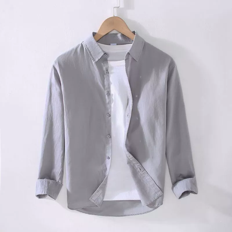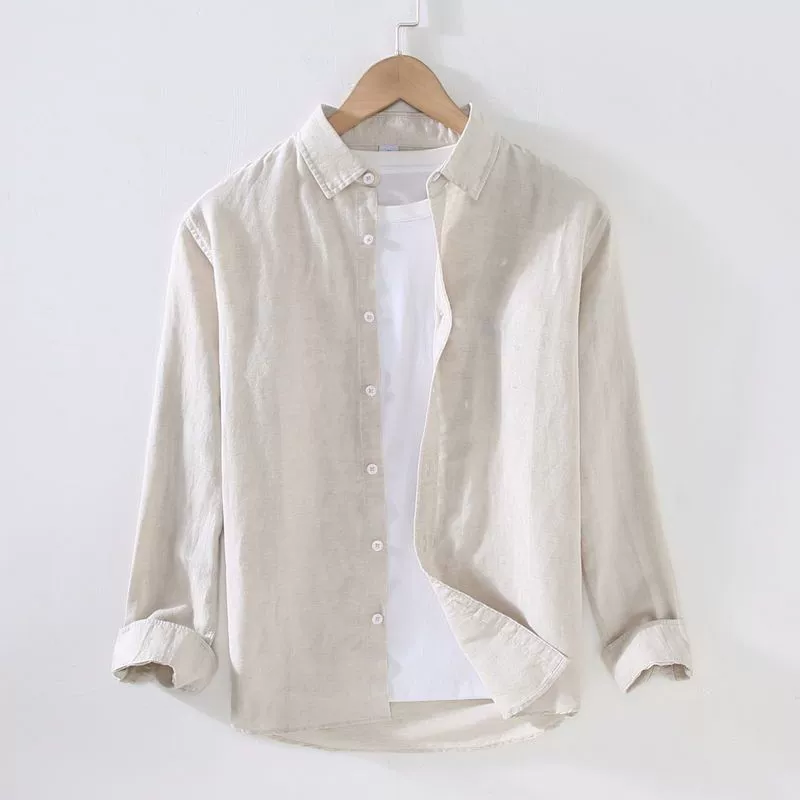 Solid color thin linen long-sleeved shirt for men’s cotton linen shirt casual versatile comfortable and breathable sesame spring and summer trend