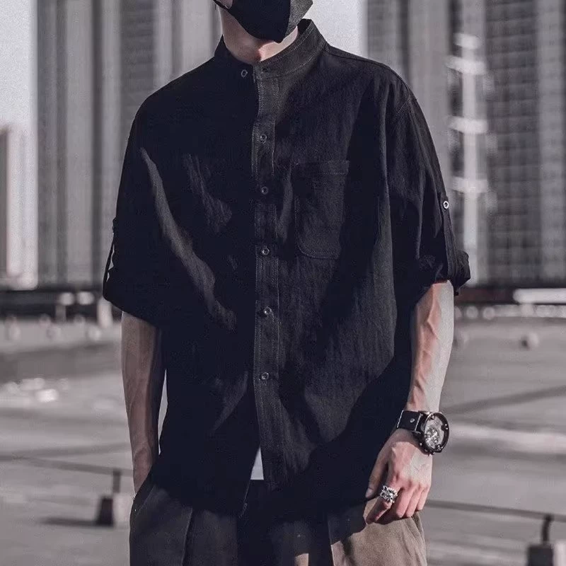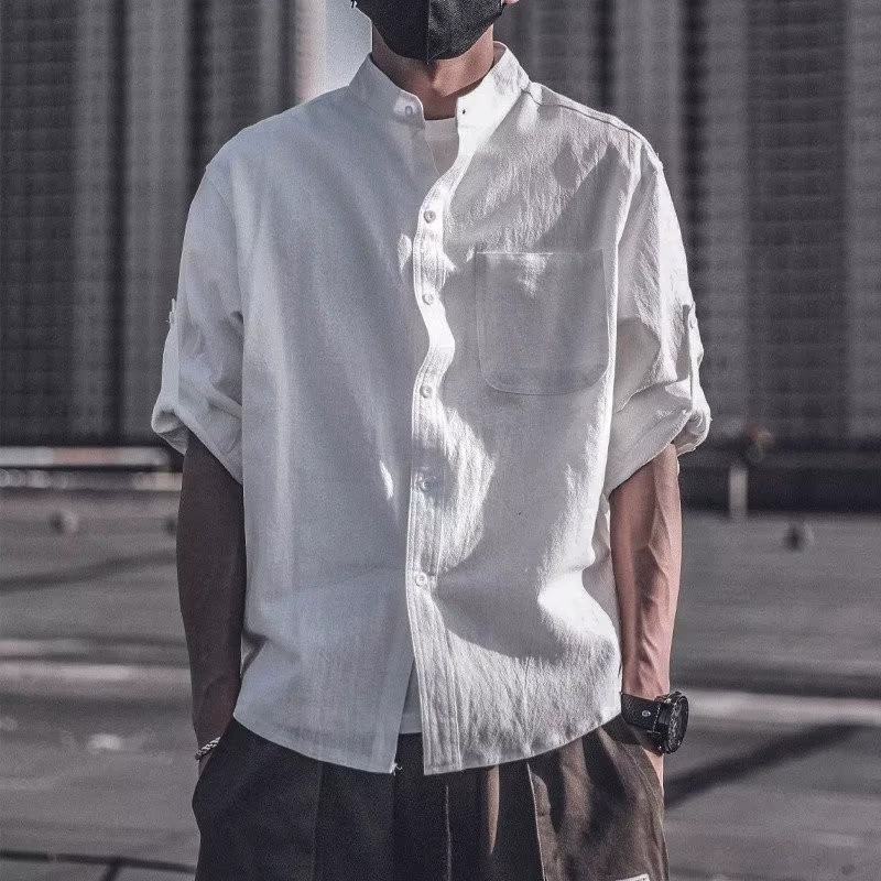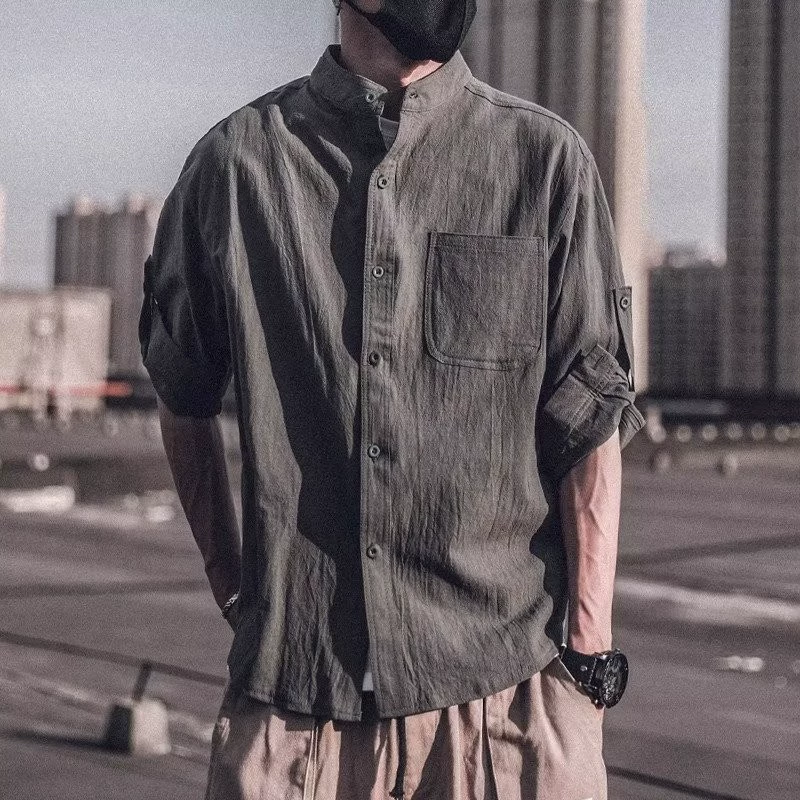 | nameOriginal | Trendy retro cotton and linen Hong Kong style stand collar short-sleeved shirt |