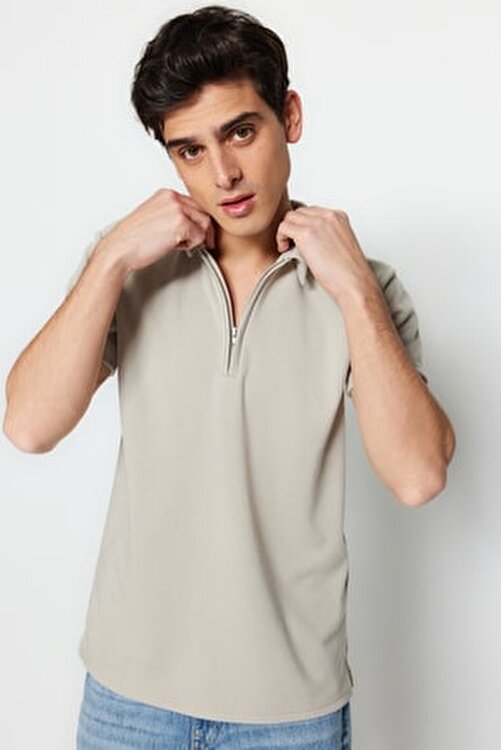 TRENDYOL MAN Limited Edition Stone Men Regular/Regular Fit Thick Pique Zippered Polo Neck T-shirt