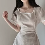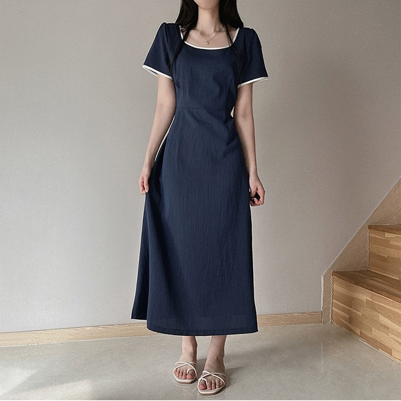 | nameOriginal | Trimmed color block square neck slit back lace up waist cotton and linen dress women's summer dopamine wear long skirt |