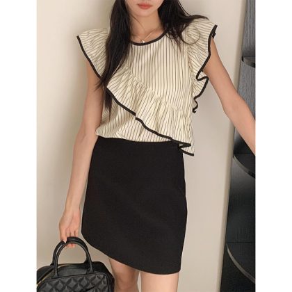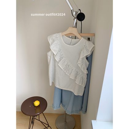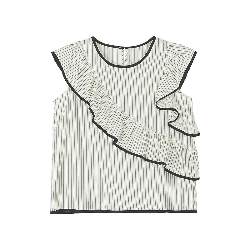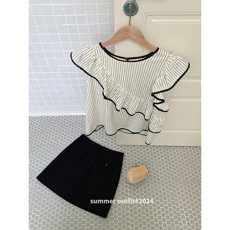 | nameOriginal | [Truffle Coco] Song Ming Ruffle Striped Retro Small Shirt 2024 Summer New Round Neck Top X1442F |