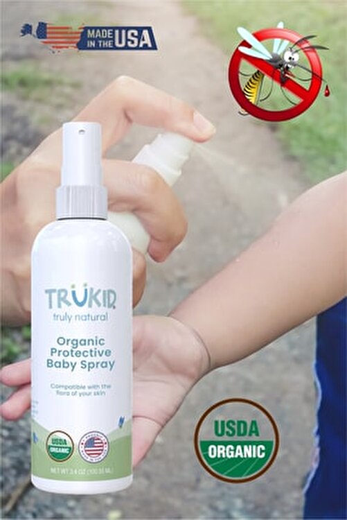 TRUKID organic protective baby spray Protective body spray TURKEY IS A SINGLE USDA ORGANIC certified product %100 NATURAL AND ORGANIC INGREDIENTS VEGAN PARABEN, ALCOHOL, PERFUME, SLS VEDE NO CHEMICAL SUBSTANCES SAFE FOR BABIES, CHILDREN AND ADULTS. NOTE: PLEASE AVOID CONTACT WITH MOUTH AND EYE. IN CASE OF CONTACT, RINSE WITH PLENTY OF WATER. EXPIRATION DATE:10/2025 SHOULD BE USED WITHIN 24 MONTHS AFTER OPENING THE LID.