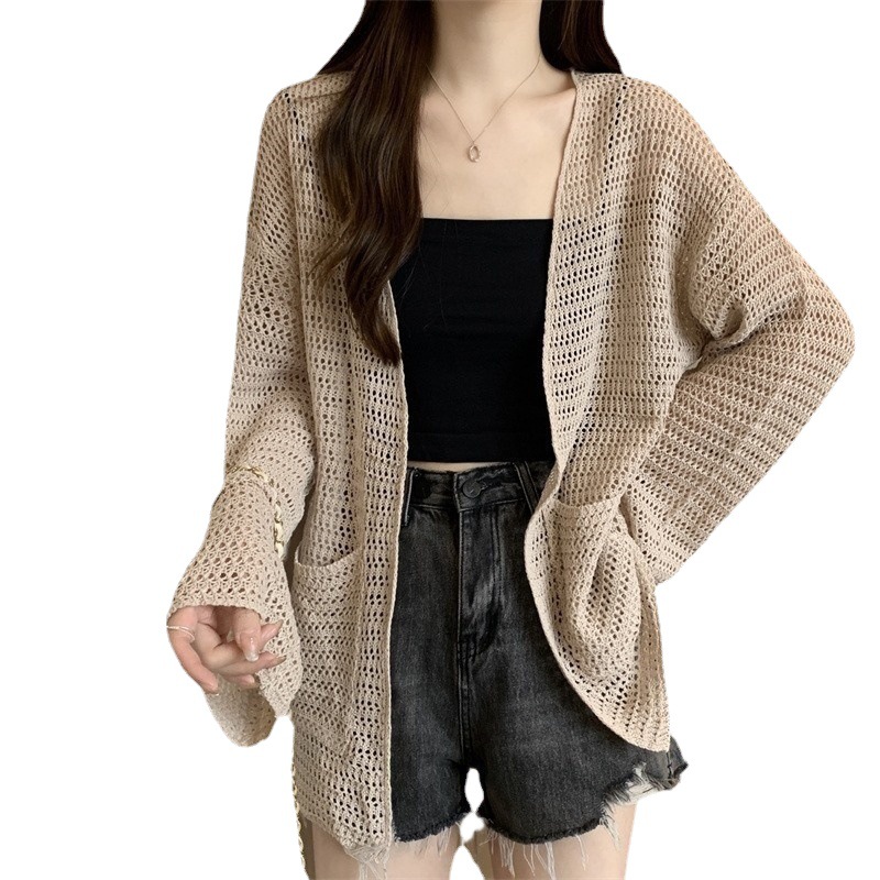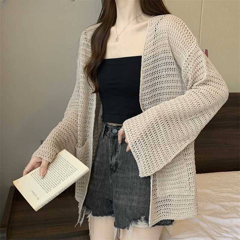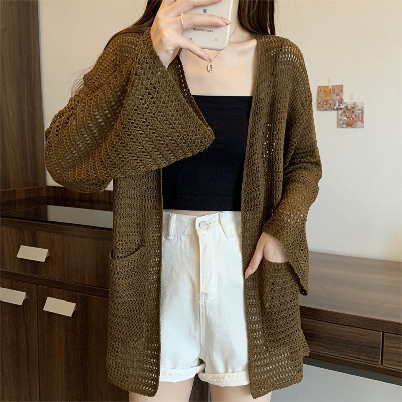 Tulle Ice Silk Sunscreen Blouse Carrying Sweater Middle V-Neck Hollow Summer Shoulder Butt Long Knitted Cardigan