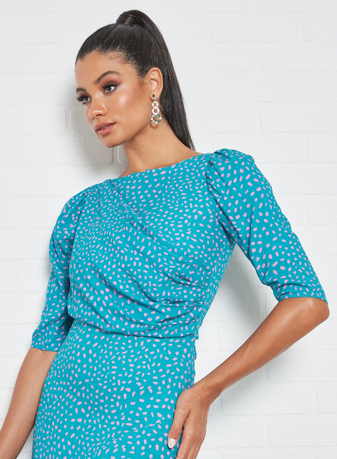 This product features a cozy and plush viscose material that feels great against the skin. It also boasts a unique design with contrasting speckles throughout. The boat neckline and short, puffy sleeves add a touch of elegance, while the asymmetrical hemline with a front slit creates a modern and trendy look. The secure zipper closure in the back ensures a snug and comfortable fit. With an A-line silhouette and midi length, this garment is both stylish and practical. To keep it looking its best, simply follow the care label instructions when washing.