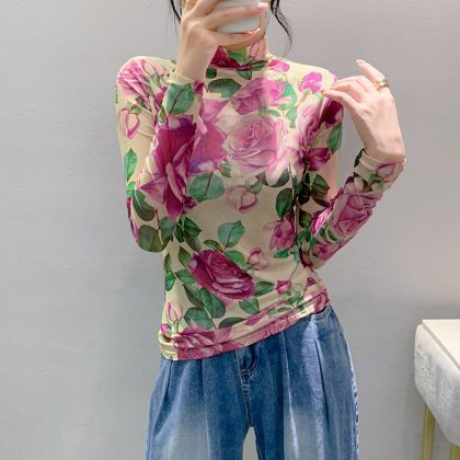 | nameOriginal | Turtleneck mesh bottoming shirt women's long-sleeved slim T-shirt spring and autumn European fashion printed plus size top all-match small shirt |