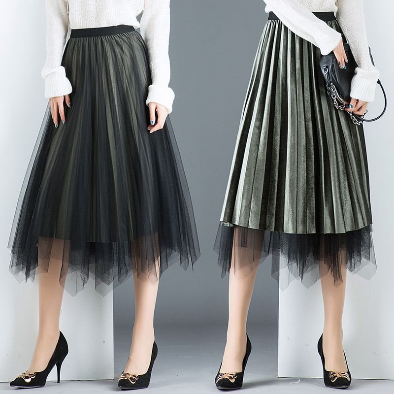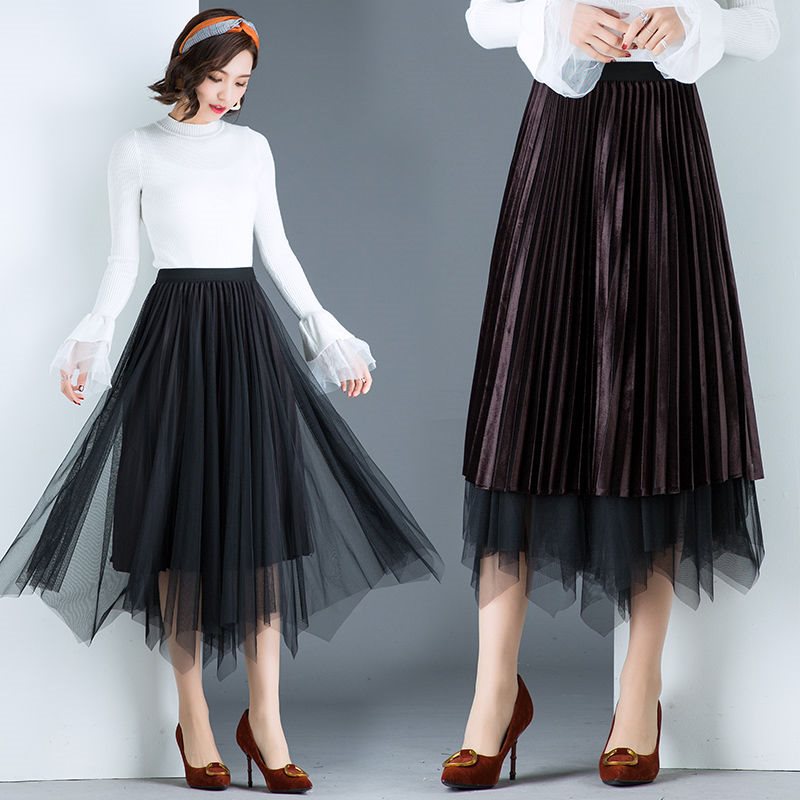 Two-Face Wearing Spring and Autumn Metallic Velvet Pleated Skirt Korean Style Irregular High Waist Mesh A- Line Skirt Women's Skirt