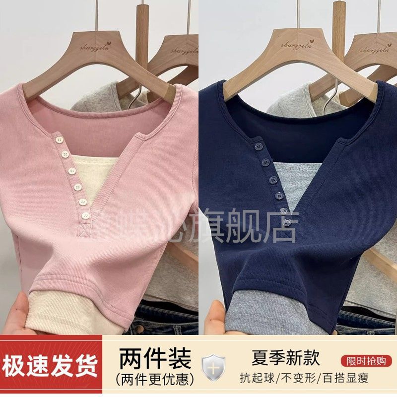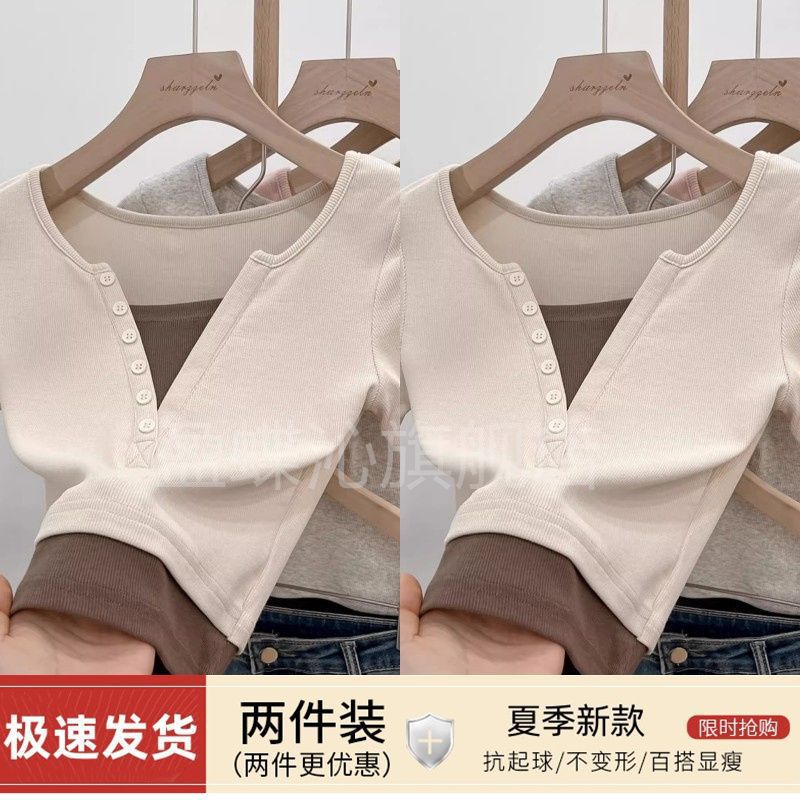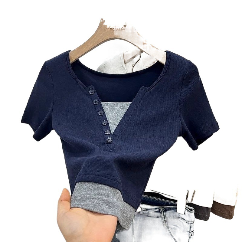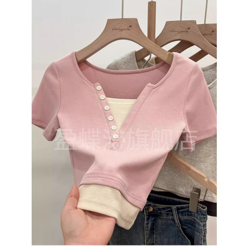 [Two-piece Pack] Fake Two-piece Short-sleeved Shirt Women's Summer New Design Sense Stitching Contrast Color Pure Short Top
