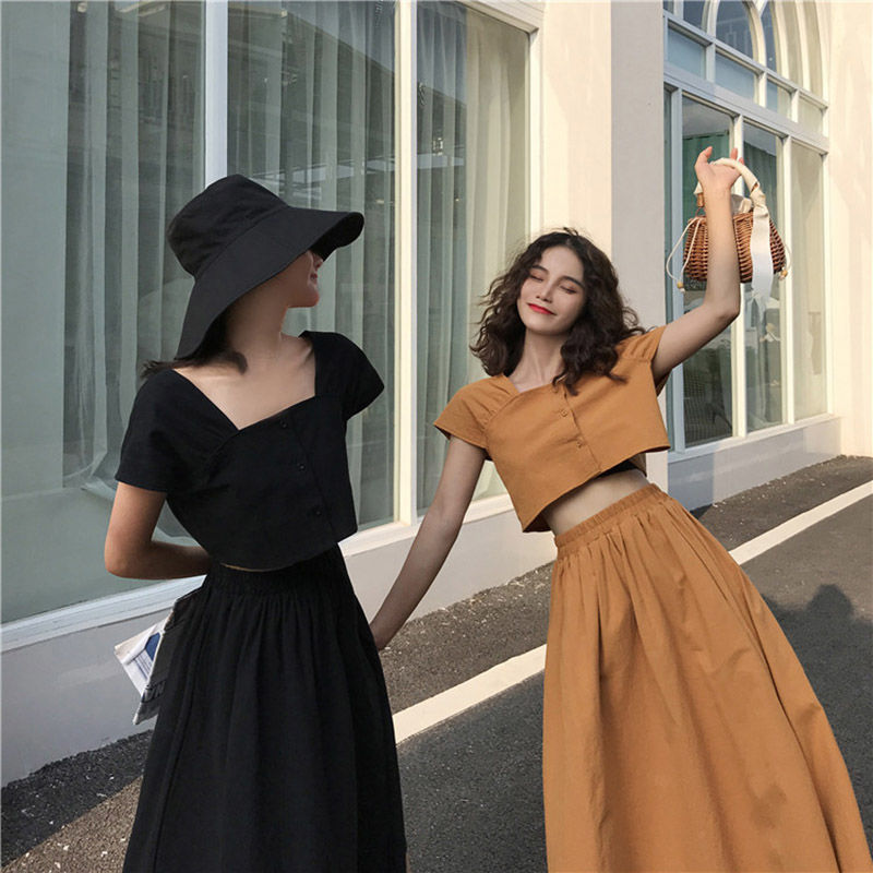 | nameOriginal | [two-piece set] girlfriends French short-sleeved top women's short high waist A- line long skirt fashion suit |