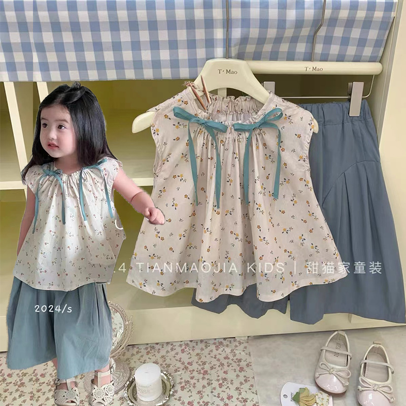 Two-piece Suit Summer New Girls' 2024 Top Floral Shirt Children's Wide Leg Cropped Pants Baby's Cotton Cloth Pants
