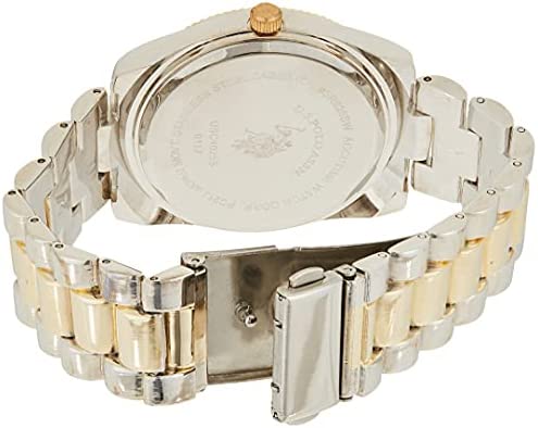 This product features a glass dial window with the U.S. POLO ASSN. wording and logo, providing a sleek and stylish look. The analog display showcases a gold hour and minute hand, complemented by a gold bezel and gold tone. The fold over clasp ensures a secure and comfortable fit.
