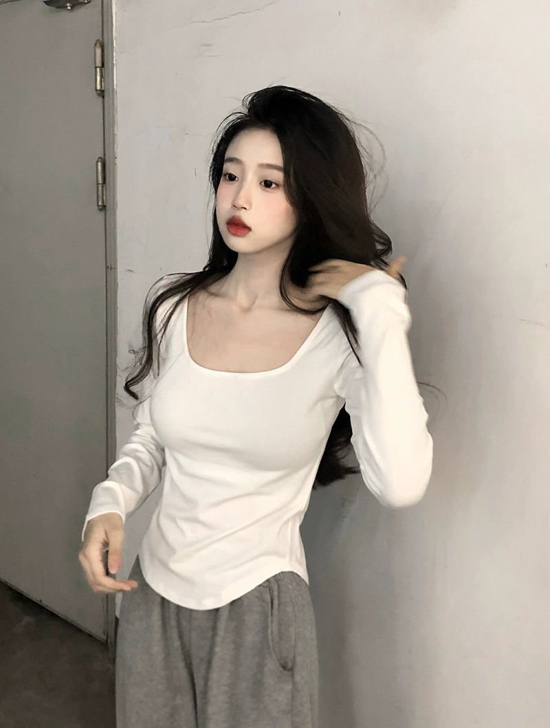 U-neck long sleeves, front shoulders, fat mm, slimming, belly-hiding T-shirt