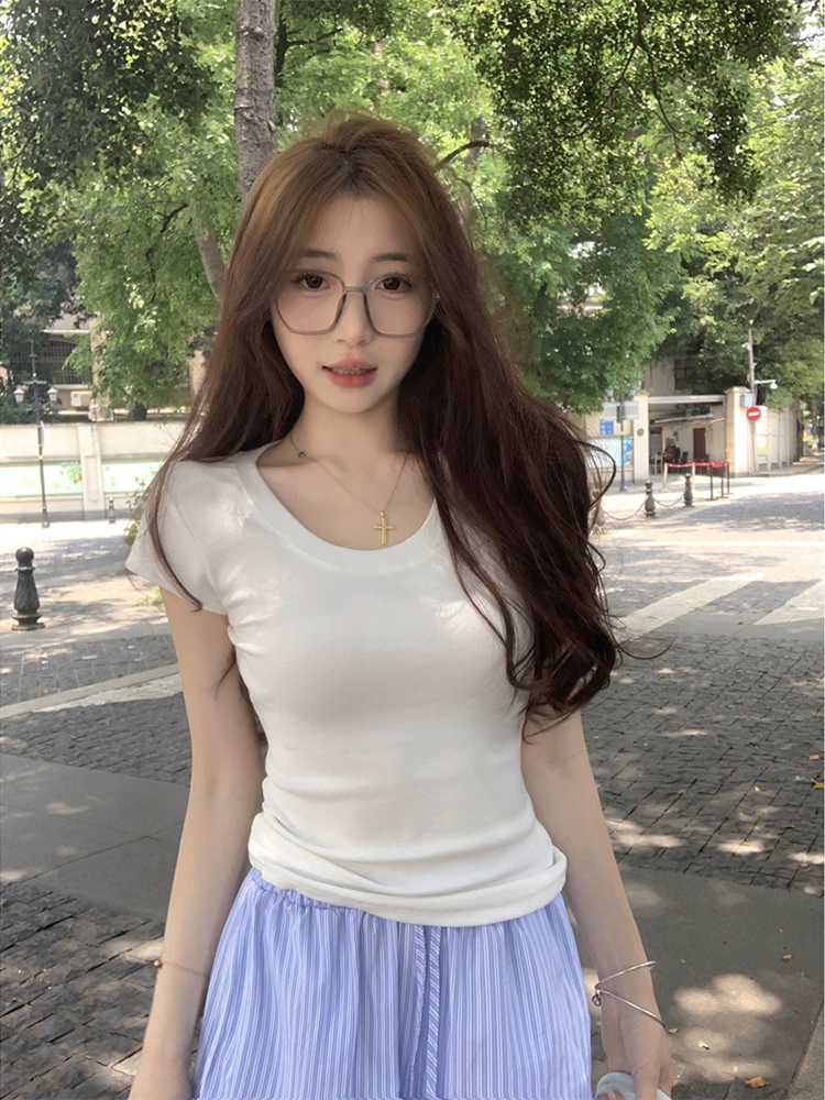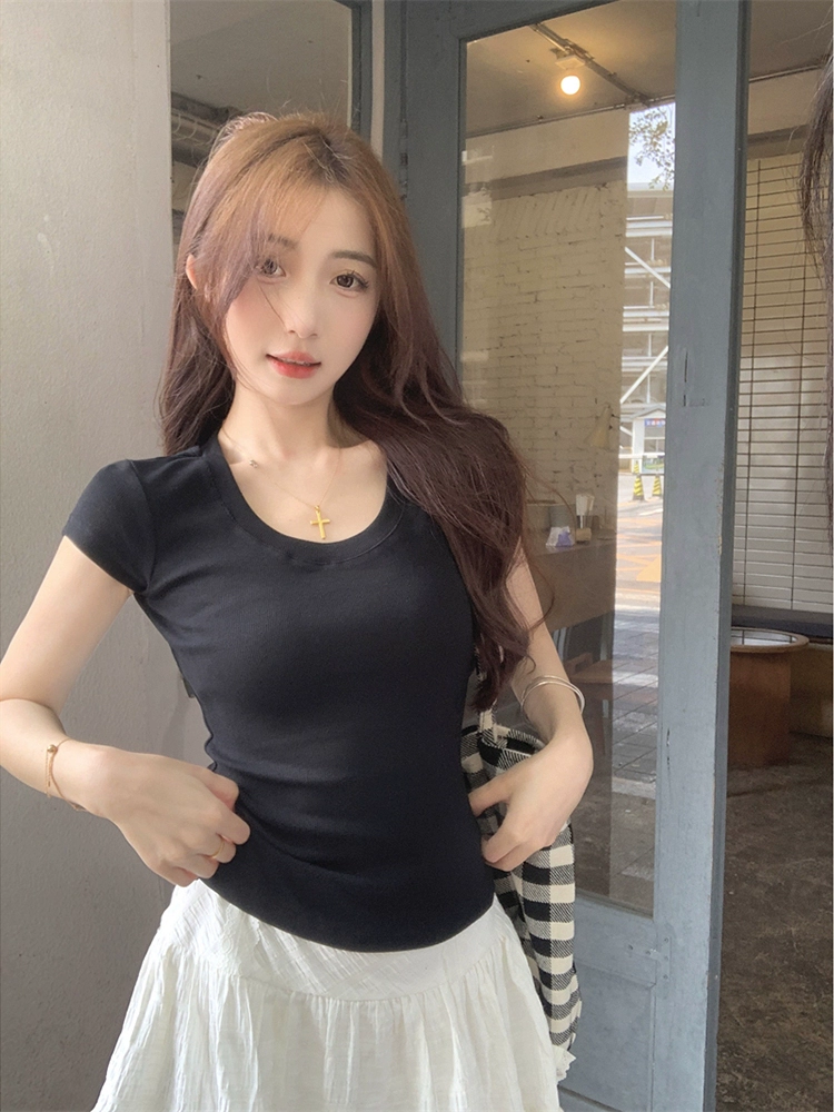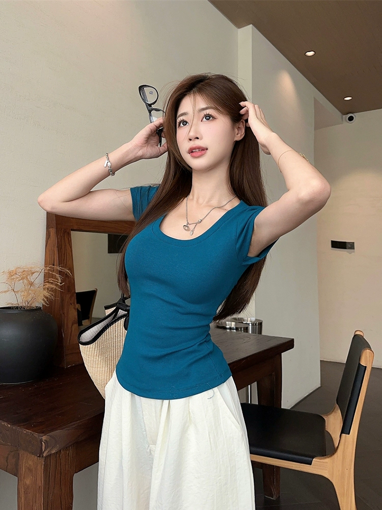 U-neck right shoulder summer new versatile solid color short-sleeved T-shirt