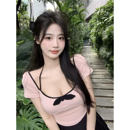 | nameOriginal | U-neck sexy collarbone-exposing T-shirt short-sleeved low-cut bow |