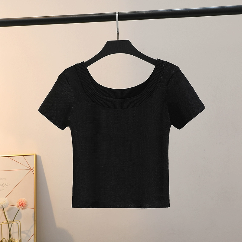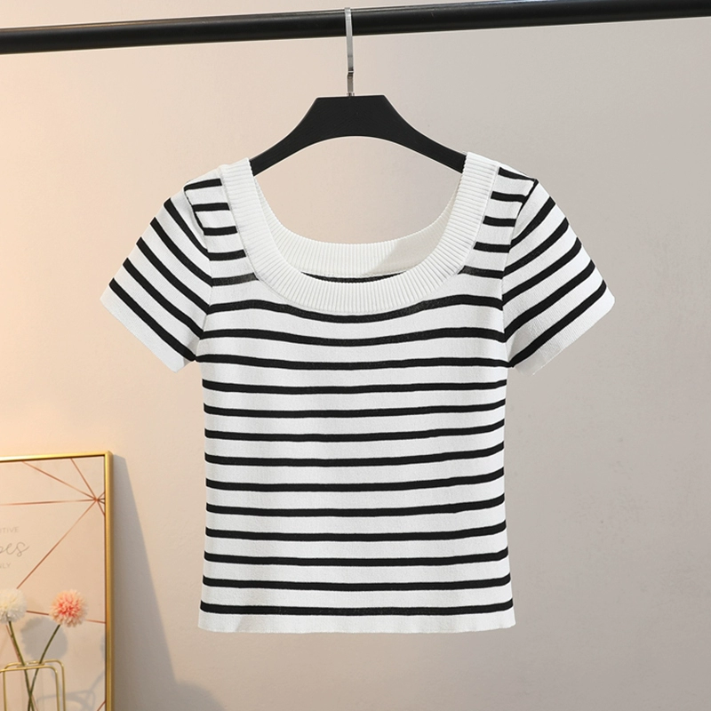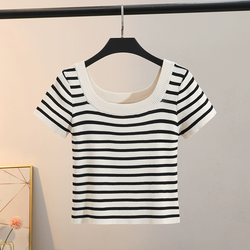 U -shaped factory direct hair -style square collar striped short -sleeved T -shirt