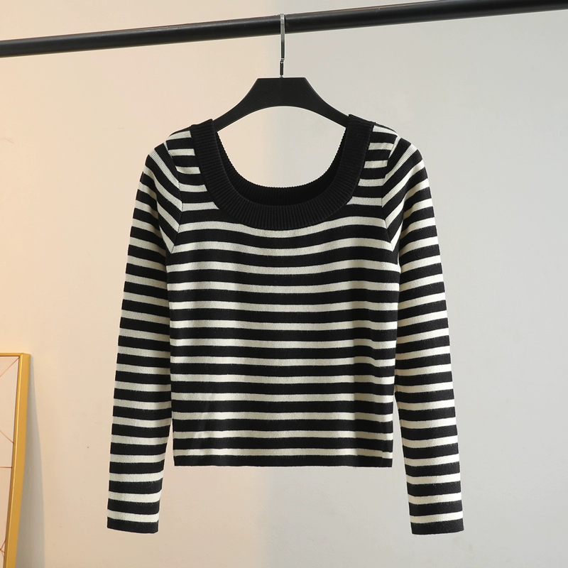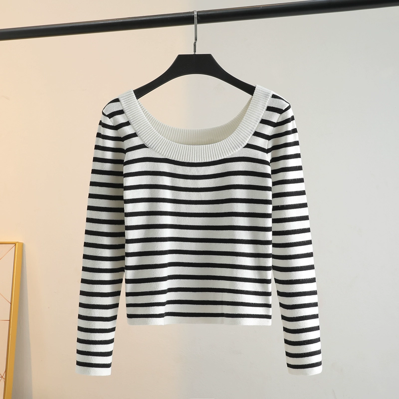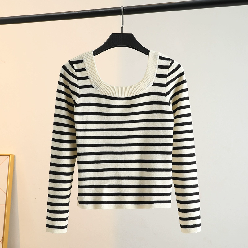U-shaped factory straight hair French square neck striped short-sleeved T-shirt