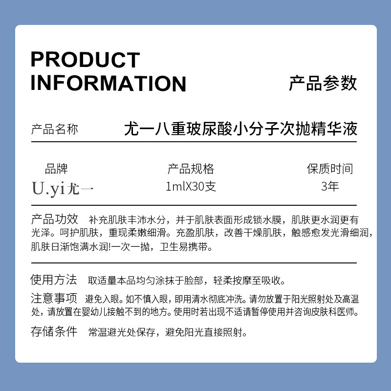 | nameOriginal | U.yi youyiba hyaluronic acid small molecule disposable essence facial essence hydrating moisturizing hyaluronic acid stock solution |
