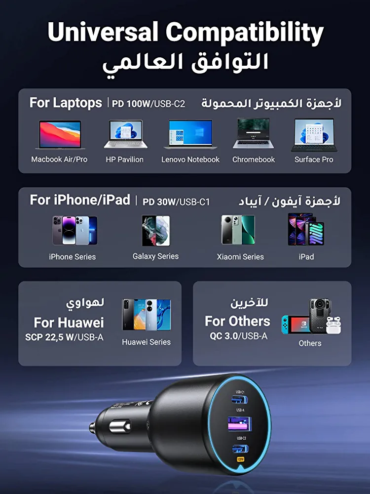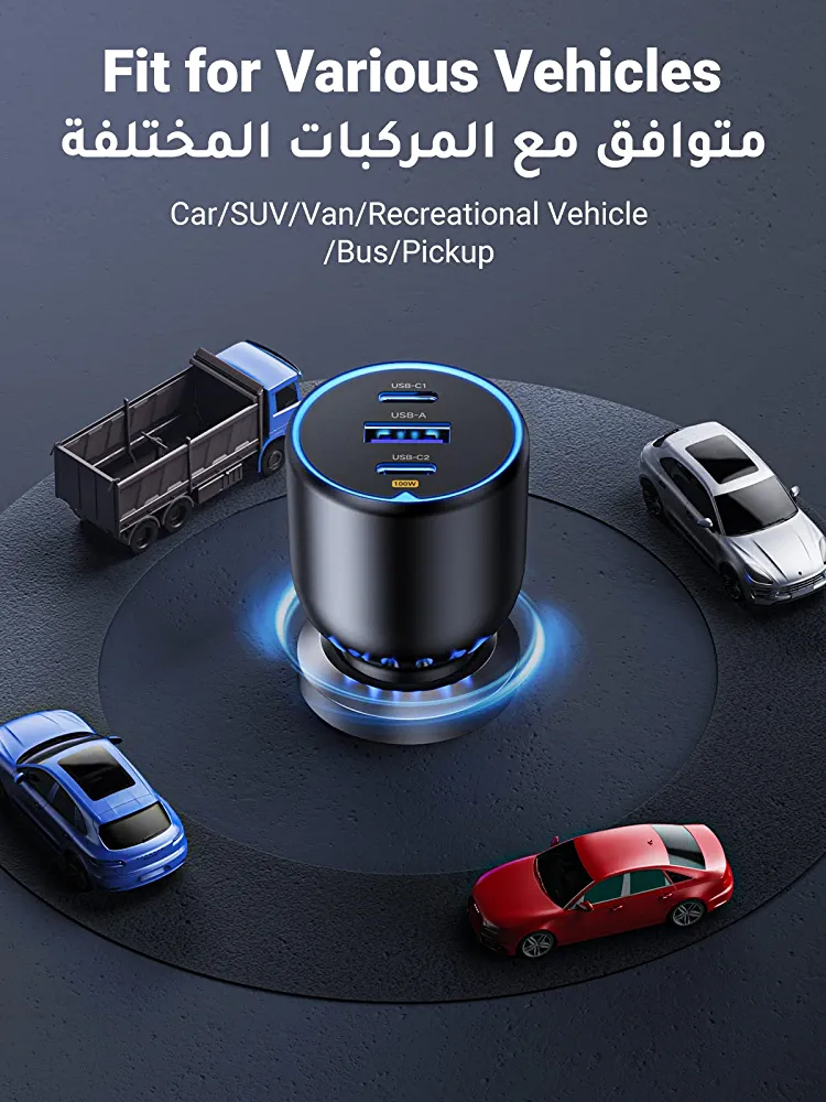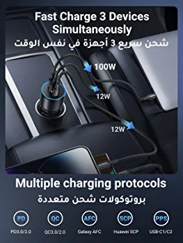 UGREEN 130W 3-Port USB Car Charger, meets all your demands for charging multi-devices on the car.