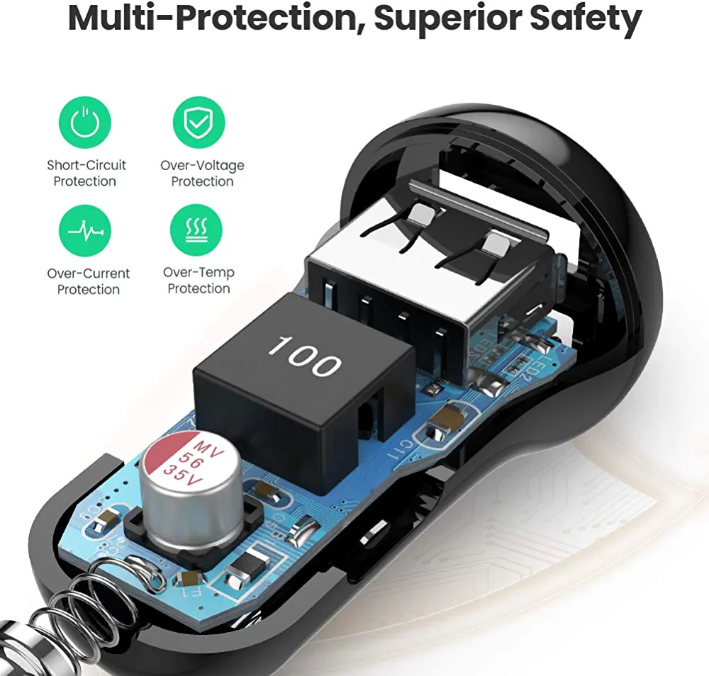Built-in smart chip, this car charger adapter can protect your devices from short-circuit, over-voltage etc and provide a safer charging experience for you.