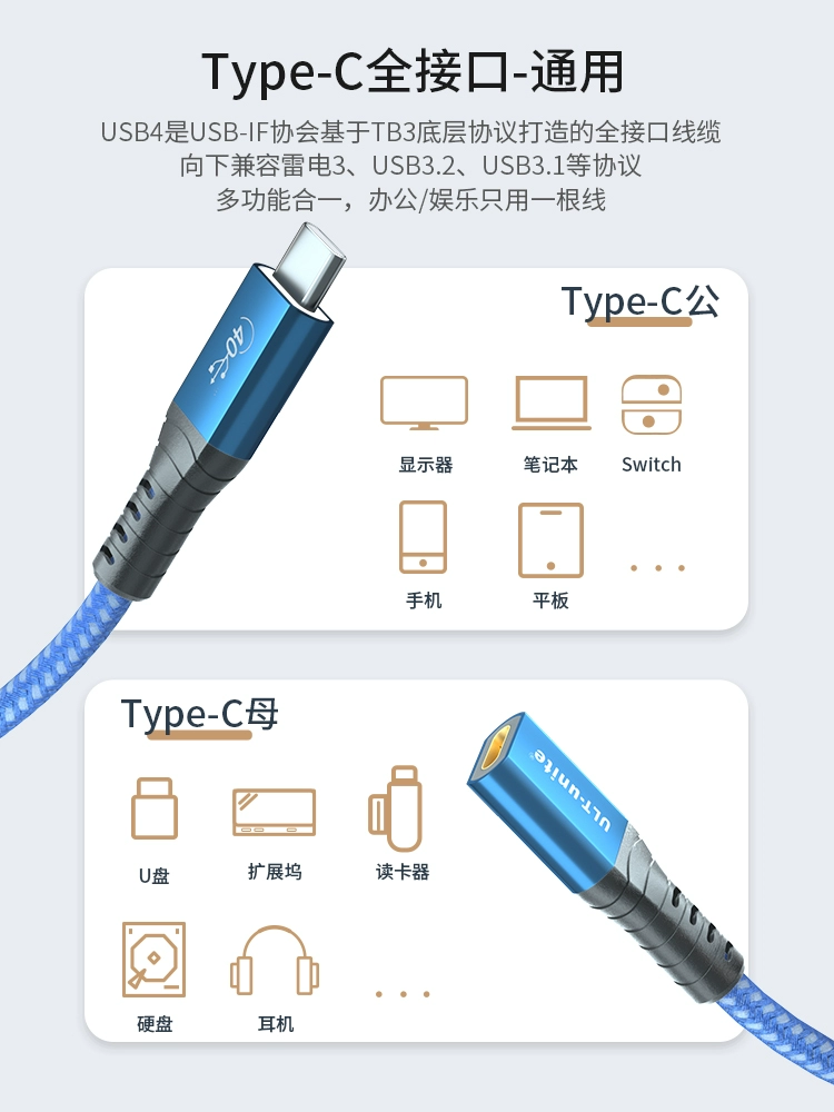 | nameOriginal | ULT-unite typec extension cable USB4 data cable 40Gbps transmission PD100W fast charge 8K high-definition screen projection suitable for mac laptop full-function extension charging cable |