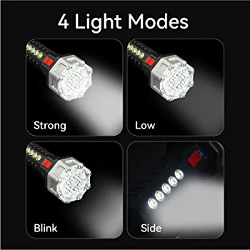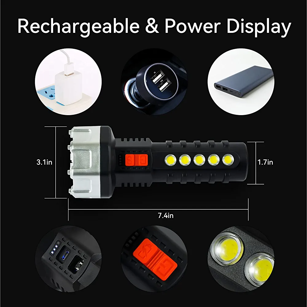 This flashlight has two charging methods: USB and solar charging. The blinking blue light indicates that the charging is in progress, while the dazzling blue light on the power display indicates that the charging is complete. It is safe, convenient, and efficient.