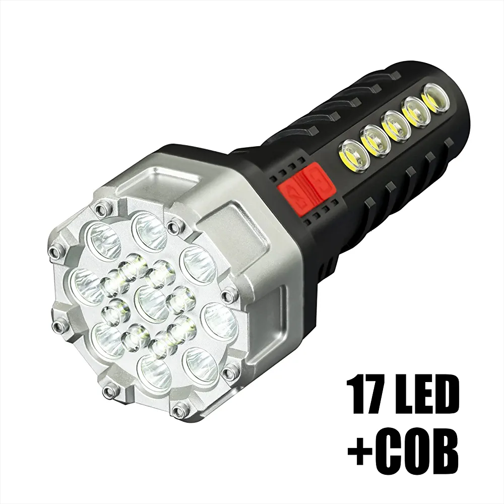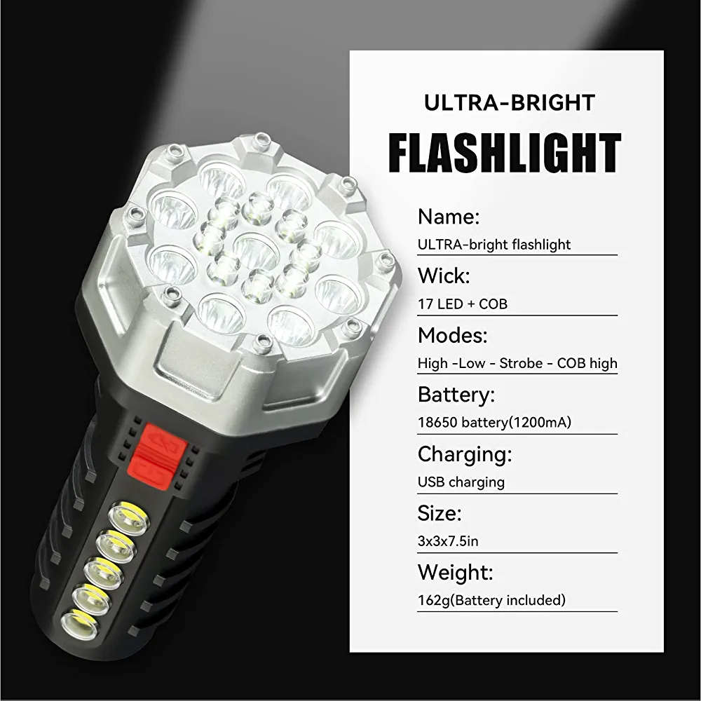 Introducing the LED Solar Flashlight, a durable and lightweight product made of plastic. It features an OSL main light and a COB side light, providing high brightness and low energy consumption. The side light is perfect for close-range and large-area lighting. With a weight of only 120g, this flashlight is easy to carry around.
