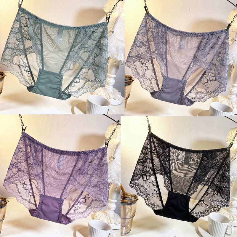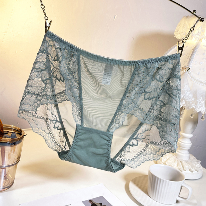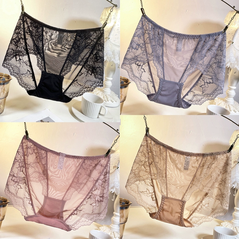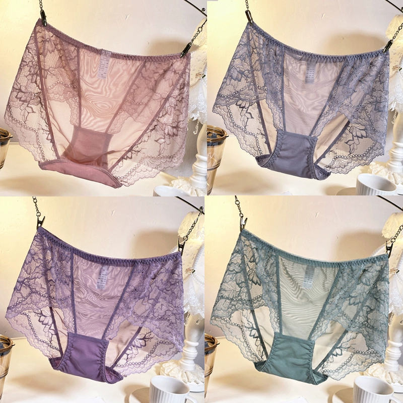 Underwear women's lace spring and summer thin sexy seamless mesh transparent cotton crotch bag hip large size fat mm medium and high waist pants