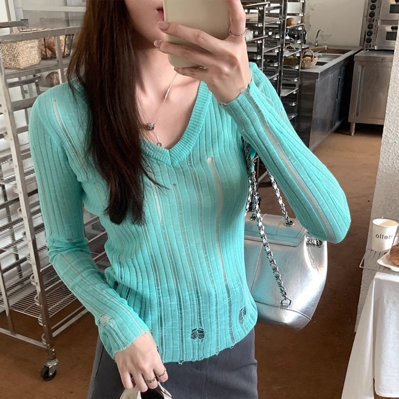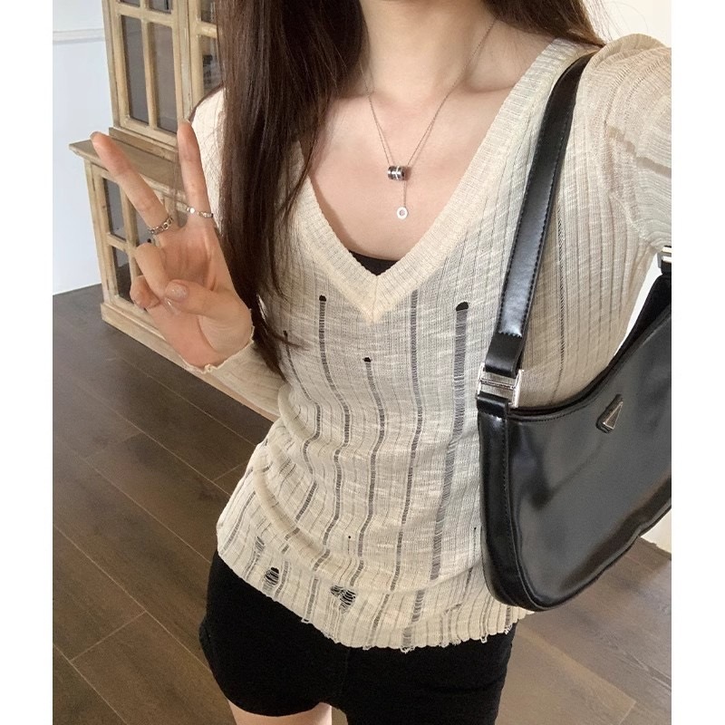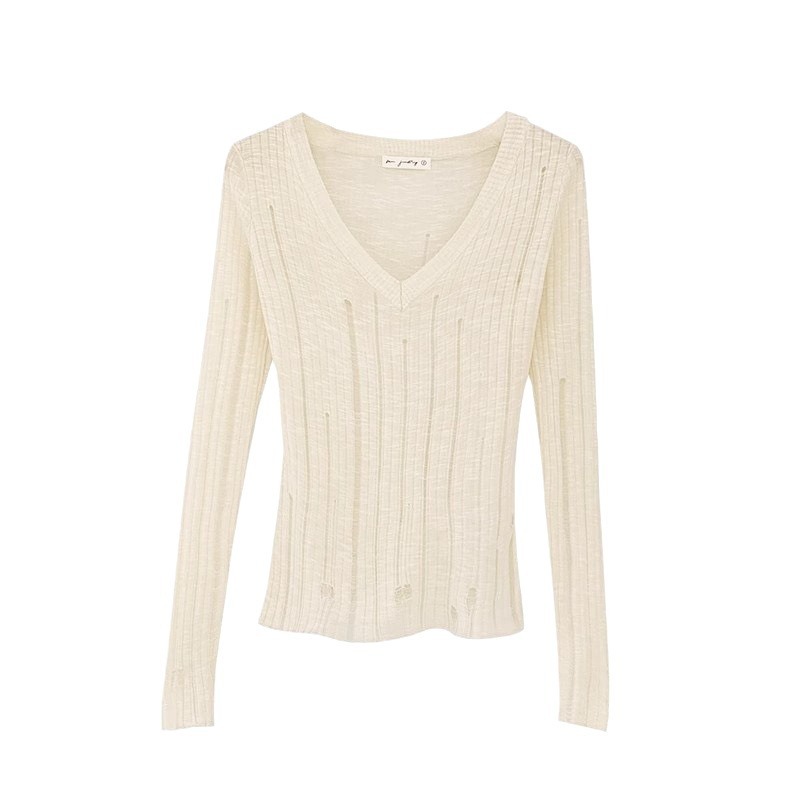 | nameOriginal | Unique and Chic Hollow-out Lazy V-neck Long-sleeved T-shirt Women's Summer Blouse Rough Waist Knitted White Sunscreen Top |