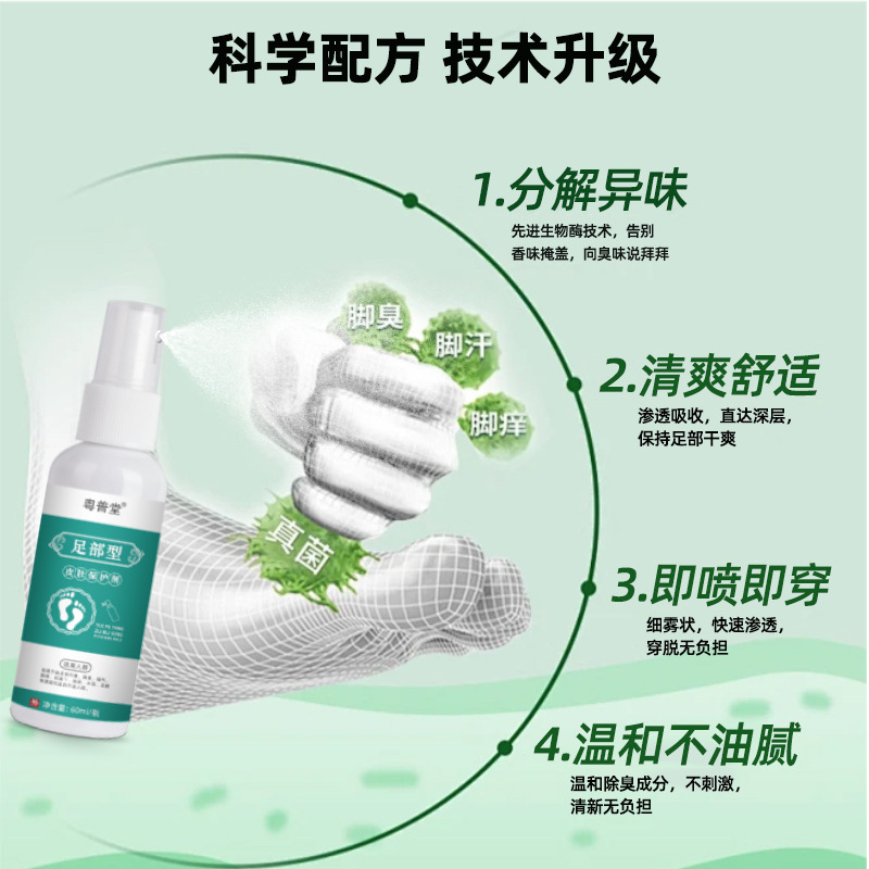 | nameOriginal | Universal foot odor foot sweat spray 60ml boxed foot special skin care solution foot itching deodorant antibacterial spray |