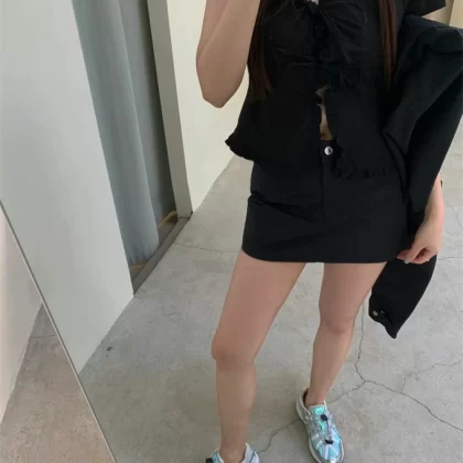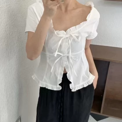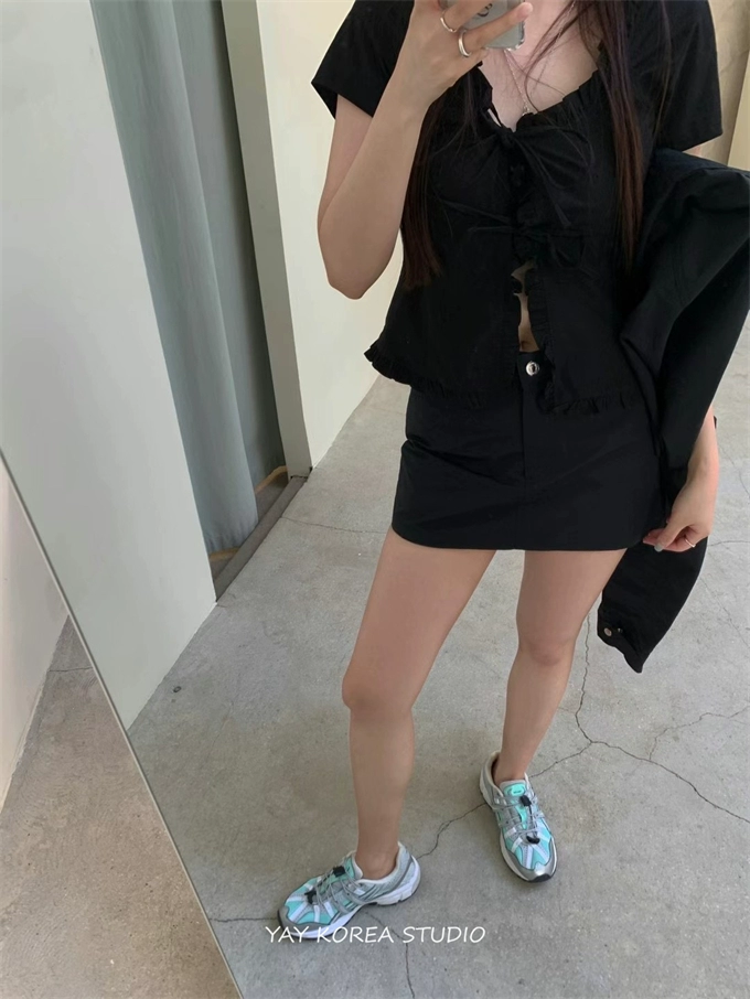 Up large collar, collarbone-exposing slim fit lace-up short-sleeved shirt