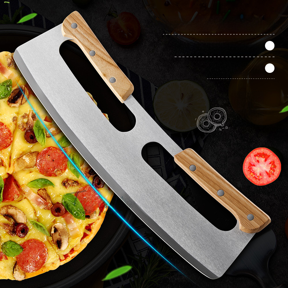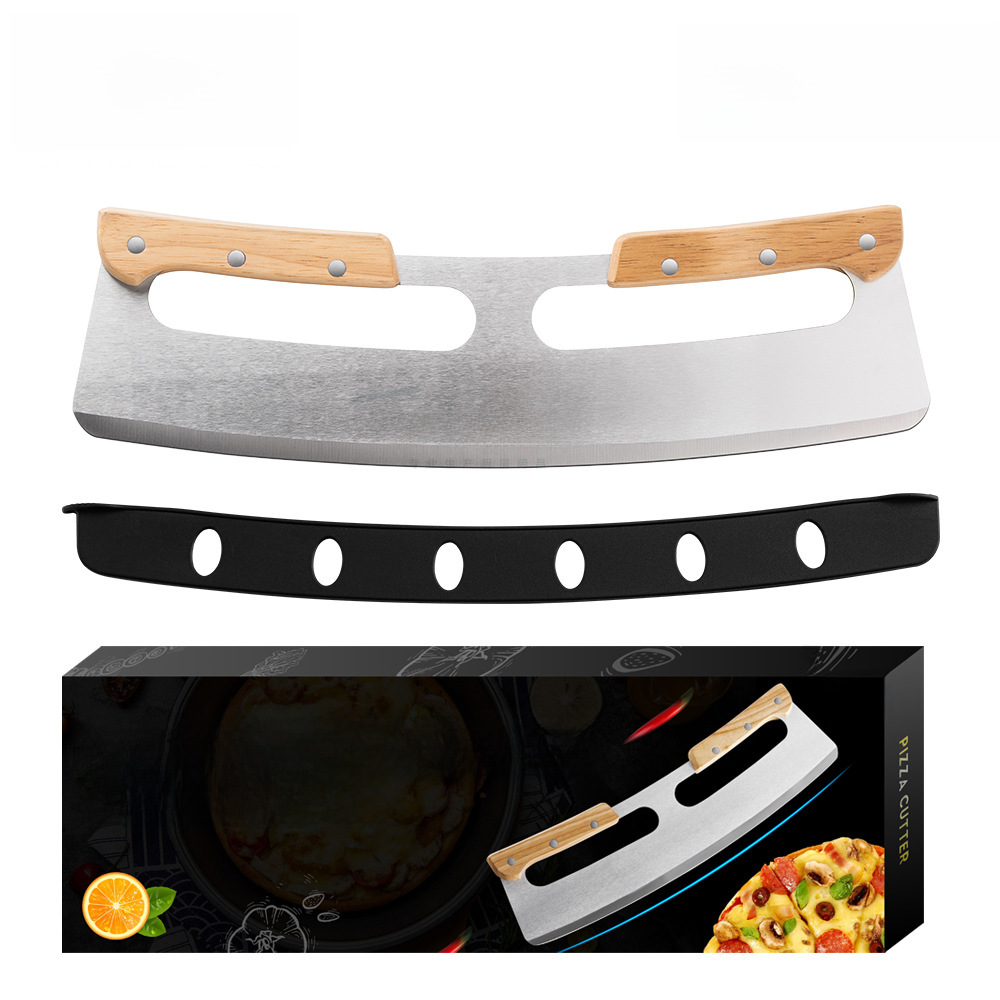 Upgrade double handle pizza cutter wooden handle semicircle Pizza Rock knife stainless steel pizza cutter brand new protective cover