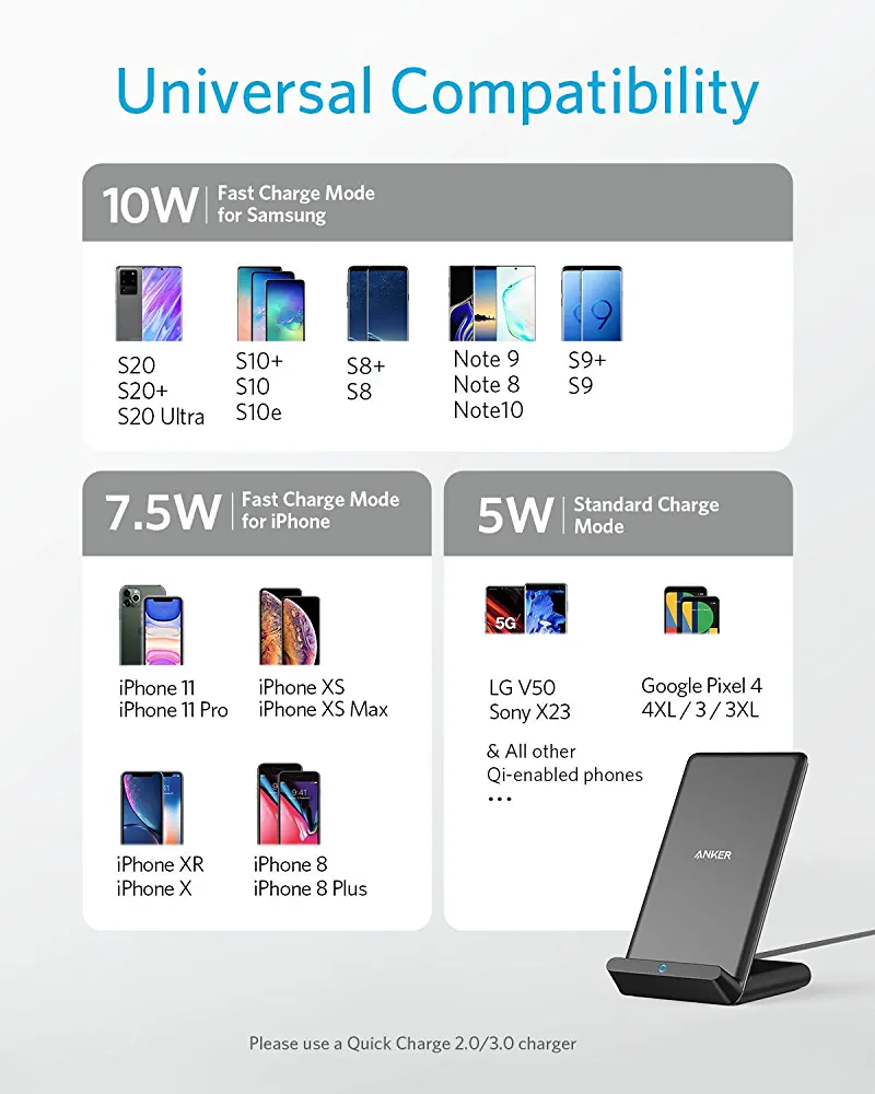 | nameOriginal | Anker Wireless Charger, 10W Max PowerWave Stand Upgraded, Qi-Certified, Fast Charging for iPhone 14/14 Pro/14 Pro Max/13/13 Pro Max, SE, 11, 11 Pro, 11 Pro Max, XR, Galaxy S20 S10 (No AC Adapter) |