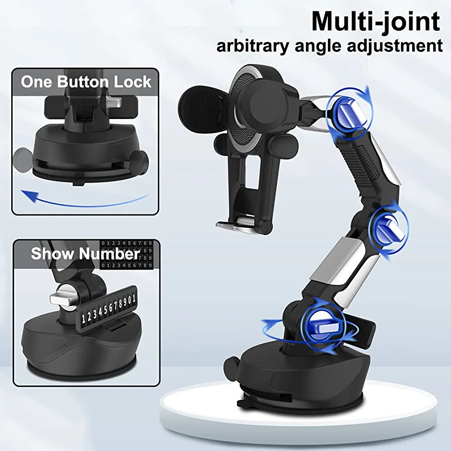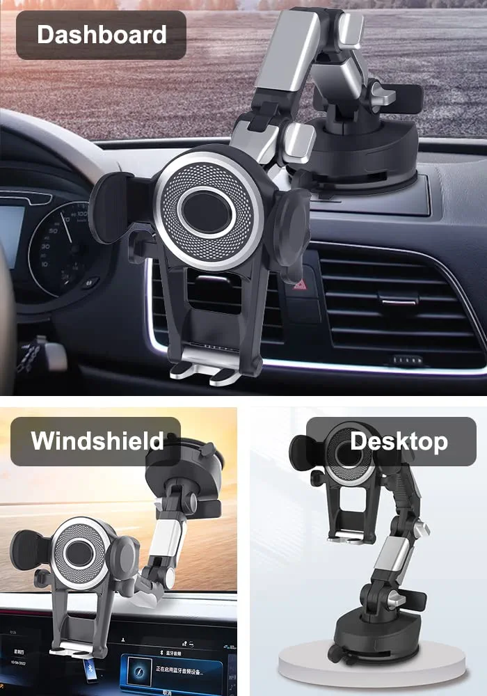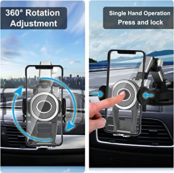 This mobile phone holder is made of high-quality ABS material, ensuring durability and resistance to scratches and breakage. The design is fashionable, simple, and practical. The holder is covered with thick silica gel liner to protect your mobile device from wear and tear. It is a 4-in-1 holder that can be flexibly placed on the dashboard, windshield, vent, and table, making it suitable for various types of vehicles. The holder can rotate 360 degrees, providing the best angle of view to meet different visual needs. It supports horizontal and vertical screen switching and has three rotary control buttons for easy adjustment of the driving angle. The holder has a strong suction cup that has passed the 1000+ suction test and is equipped with ultra-soft anti-slip rubber to prevent the mobile phone from flying out, collision, scratching, and abnormal sound. It is applicable to all 4″-7″ mobile phones and thick mobile phone cases, making it widely compatible with various iPhone models and other mobile phone brands.