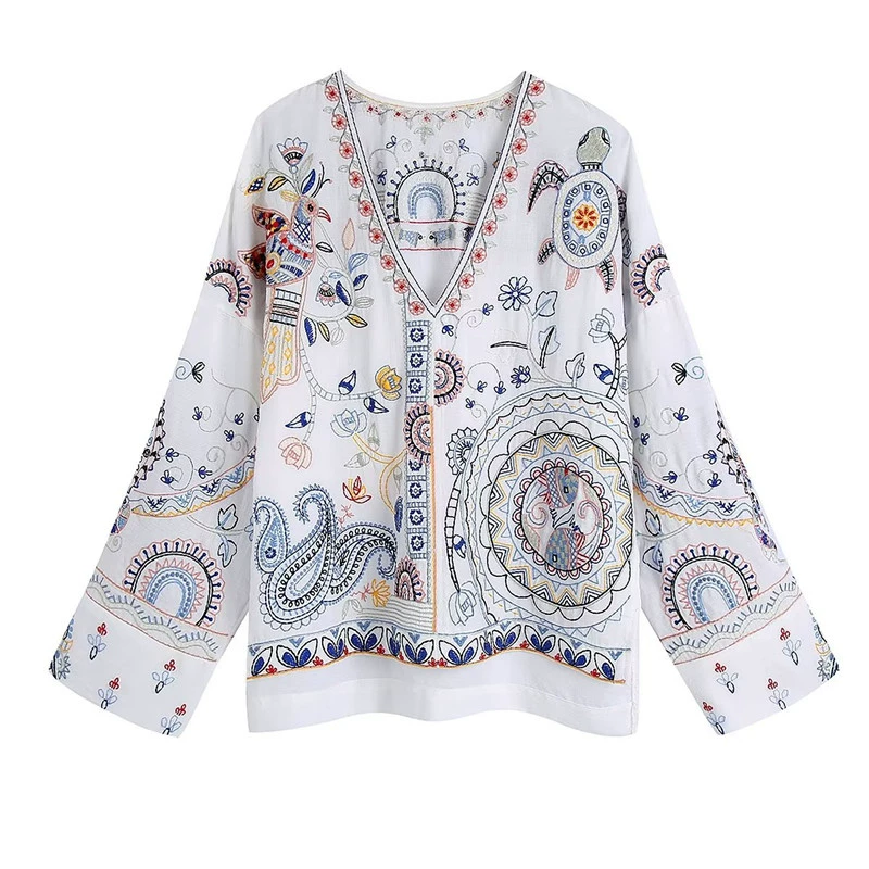 | nameOriginal | UR white side slit long sleeve V-neck shirt with embroidery |