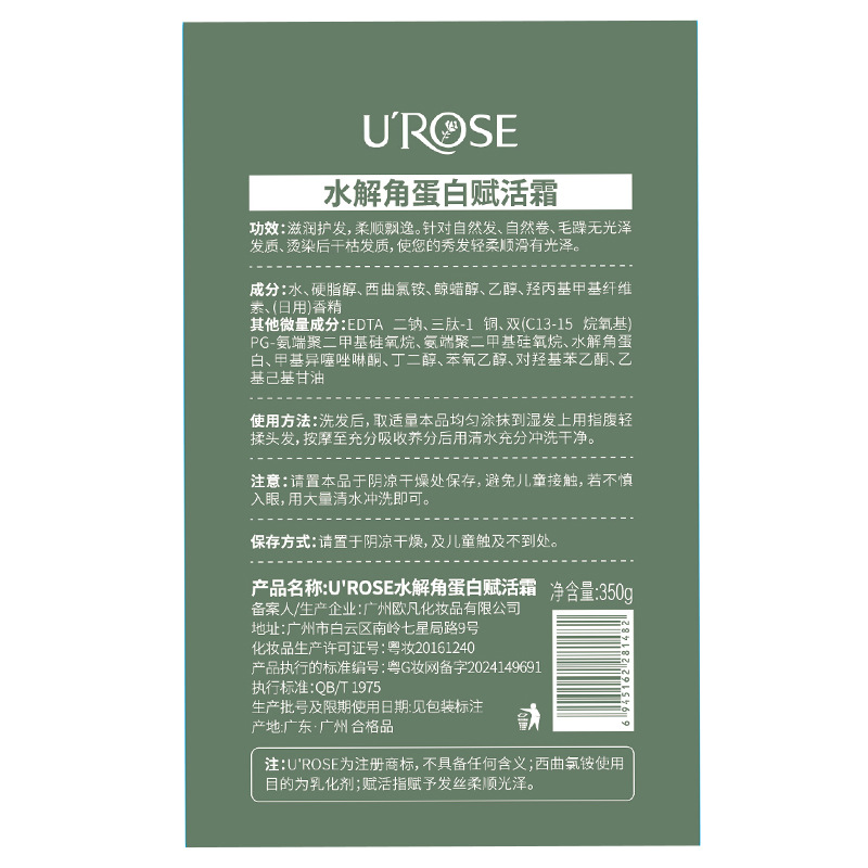 | nameOriginal | UROSE Hydrolyzed Keratin Invigorating Cream Hair Condiment Nourishing, Repair, Perm and Dyeing Dry and Irritable A Smooth Hair Mask |