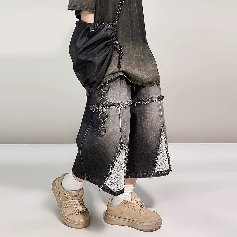 UUCSCC hip hop denim ripped wide leg cropped pants