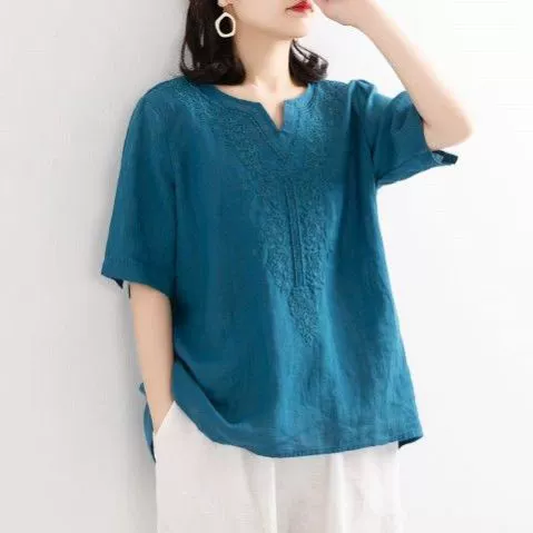 V-neck artistic loose linen pullover short sleeve embroidery